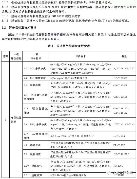 日前,中華人民共和國(guó)國(guó)家質(zhì)量監(jiān)督檢驗(yàn)檢疫總局、中國(guó)國(guó)家標(biāo)準(zhǔn)化管理委員會(huì)發(fā)布《鋼鐵燒結(jié)煙氣脫硫除塵裝備運(yùn)行效果評(píng)價(jià)技術(shù)要求GB/T 34607-2017  》。根據(jù)標(biāo)準(zhǔn)要求,鋼鐵燒結(jié)煙氣脫硫除塵裝備運(yùn)行效果評(píng)價(jià)總分為100分,其中:脫硫裝備包括環(huán)保性能評(píng)價(jià)30分,技術(shù)經(jīng)濟(jì)評(píng)價(jià)15分,資源和能源消耗評(píng)價(jià)25分、生產(chǎn)管理評(píng)價(jià)10分和主要裝備性能評(píng)價(jià)20分;除塵裝備包括環(huán)保性能評(píng)價(jià)40分,生產(chǎn)管理評(píng)價(jià)20分和主要裝備性能評(píng)價(jià)40分。濕法脫硫性能指標(biāo)包括SO2排放濃度、SO3排放濃度、脫硫效率、霧滴濃度、顆粒物排放濃度、NOx濃度、二惡英濃度等,詳見表1。半干法/干法脫硫性能指標(biāo)包括SO2排放濃度、SO3排放濃度、脫硫效率、顆粒物排放濃度、NOx濃度、二惡英濃度等,詳見表2。電除塵、袋除塵主要性能指標(biāo)包括顆粒物濃度、去除率、本體漏風(fēng)率、壓力降等,詳見表3、4。